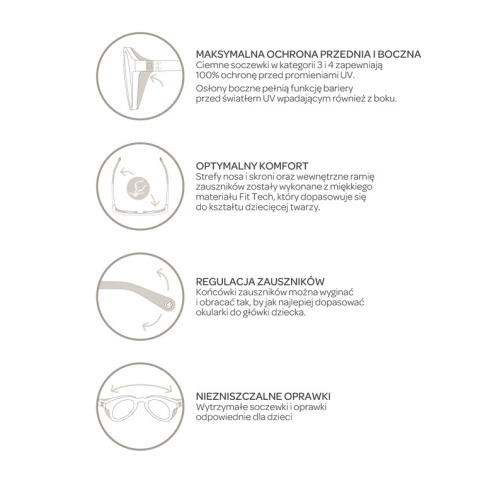 Okulary przeciwsłoneczne z kolekcji Happy francuskiej marki BEABA przeznaczone są dla dzieci powyżej 2. roku życia. Zaprojektowane z naciskiem na praktyczność, bezpieczeństwo i wygodę użytkowania, a przede wszystkim ochronę oczu malucha. Antypoślizgowe, zakrzywione ramiona nie uciskają głowy dziecka, są dobrze dopasowane i pozostają na miejscu, także podczas typowych dziecięcych aktywności. Profilowanie strefy nosa nawiązuje do stylu vintage, jest uniwersalne i wyjątkowo stabilne, a ponadto wraz ze strefą skroni wykonane zostało w technologii Fit z elastycznego, trwałego tworzywa, które dopasowuje się do kształtu twarzy. Szczególny, obły kształt rozbudowanych oprawek zabezpiecza oczy malucha przed promieniami słonecznymi wpadającymi również z boku. Specjalne, nietłukące się „szkiełka” w kolorze ciemnobrązowym to soczewki kategorii 3, która gwarantuje maksymalną, 100% ochronę przed promieniami UV. Nadają się do ekspozycji na słońce również na plaży czy w górach. Okulary posiadają regulowane zauszniki 360° oraz elastyczną opaskę, którą można w razie potrzeby zamocować na klik (dzięki silikonowym zaczepom) dla optymalnego komfortu.
