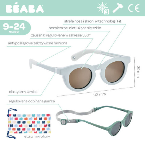 Okulary przeciwsłoneczne francuskiej marki BEABA przeznaczone są dla dzieci powyżej 9. miesiąca życia. Zaprojektowane z naciskiem na praktyczność, bezpieczeństwo i wygodę użytkowania, a przede wszystkim ochronę oczu malucha. Antypoślizgowe, zakrzywione ramione nie uciskają głowy dziecka, są dobrze dopasowane i pozostają na miejscu, również podczas typowych dziecięcych aktywności. Strefa nosa i skroni wykonana została w technologii Fit z elastycznego, trwałego tworzywa, które dopasowuje się do kształtu twarzy. Szczególny, obły kształt oprawek zabezpiecza oczy malucha przed promieniami słonecznymi wpadającymi również z boku. Specjalne, nietłukące się „szkiełka” to ciemne soczewki kategorii 3, tj. gwarantujące maksymalną, 100% ochronę przed promieniami UV. Nadają się do ekspozycji na słońce również na plaży czy w górach. Okulary posiadają regulowane zauszniki 360° oraz elastyczną opaskę, którą można w razie potrzeby zamocować na klik (dzięki silikonowym zaczepom) dla optymalnego komfortu.