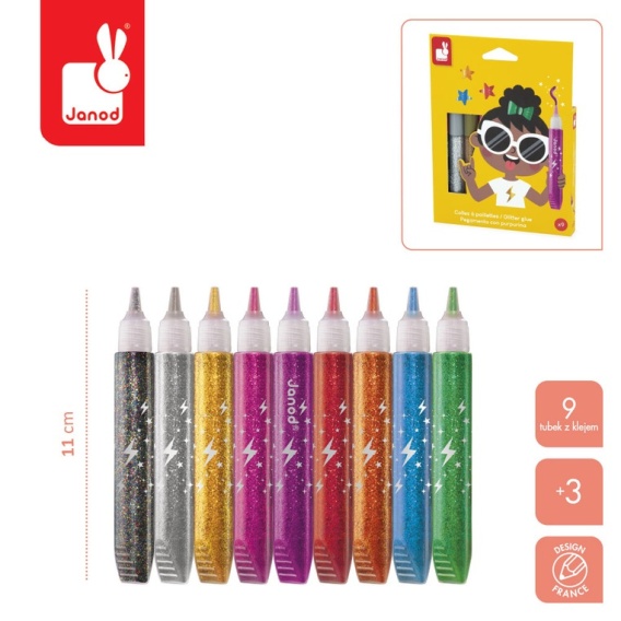 Zestaw 9 brokatowych klejów francuskiej marki JANOD w pięknych kolorach, w tym: złotym, srebrnym, miedzianym i grafitowym z wielobarwnymi drobinkami brokatu. Tubki są poręczne i mają dzióbek, ułatwiający aplikację. Zestaw zapakowany jest w estetyczne kartonowe pudełko z dziecięcą grafiką.