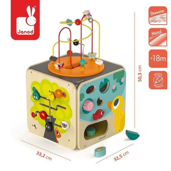 Wielofunkcyjna kostka edukacyjna z pętlą francuskiej marki JANOD to idealna zabawka dla dzieci od 18. miesiąca życia. Oferuje aż 8 aktywizujących i stymulujących rozwój zabaw. Wykonana z drewna i metalu, ma kształt sześcianu, na którego bokach umieszczone zostały różnego rodzaju „zadania” (w sumie jest ich aż 8!). W górnej części znajdują się 3 pętle z – kolejno – 3, 4 i 5 elementami do przesuwania. Są one zamocowane na okrągłej podstawie, którą można wyjąć ze ścianki kostki, obrócić i schować do środka. Na bokach kostki znajdują się: