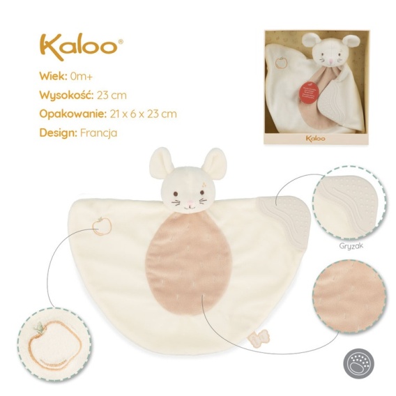 Komforter z silikonowym gryzakiem Myszka z kolekcji Grignoti francuskiej marki Kaloo to praktyczny i wyjątkowo uroczy prezent dla niemowlęcia. Przytulanka posiada silikonową końcówkę z delikatnymi rowkami i wypustkami, które łagodnie masują dziąsła, przynosząc dziecku ulgę podczas ząbkowania. Wykonana z miękkiego mikroweluru w subtelnych, kremowo-beżowych odcieniach, zapewnia maluszkowi poczucie komfortu, spokoju i bezpieczeństwa.