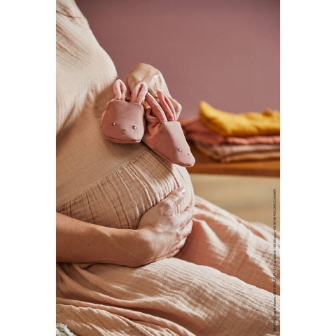 Uroczy zestaw prezentowy 3 w 1 Królik francuskiej marki KALOO to idealny pierwszy podarunek dla niemowlaka, bezpieczny od pierwszych dni życia. Zawiera piękne i perfekcyjnie wykończone akcesoria w kolorze zgaszonej terracotty: kwadratowy dwustronny komforter z główką króliczka, silikonowy dwustronny gryzak (gładki + fakturowany) z długimi uszami oraz miękkie kapciuszki z króliczym pyszczkiem i uszkami. Zabawki wspierają rozwój sensoryczny dziecka, m.in. chwytanie czy ugniatanie, przynoszą ulgę w trudnym okresie ząbkowania oraz pomagają się wyciszyć. Buciki są wykończone elastyczną nieuciskającą gumką, dzięki czemu idealnie dopasowują się do małych stópek (przeznaczone są od urodzenia do 6. miesiąca życia).