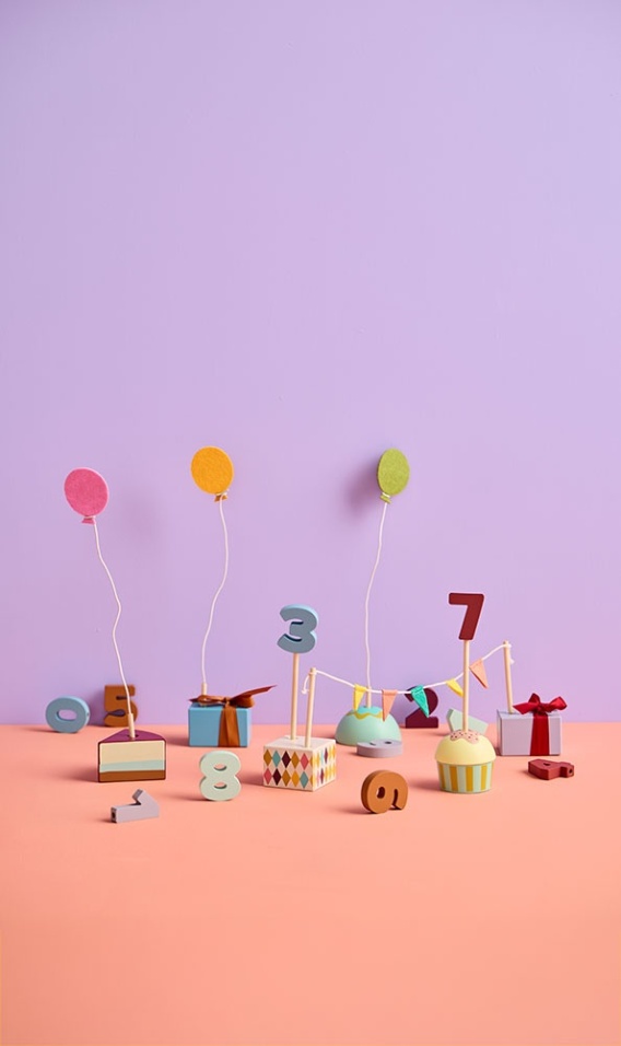W komplecie drewniane cyfry od 0 do 9 oraz dodatkowa cyfra 1, dzięki czemu zestaw posłuży na wiele kolejnych lat świętowania. Dwa filcowe baloniki na metalowych drucikach dodają całości lekkości i uroku.