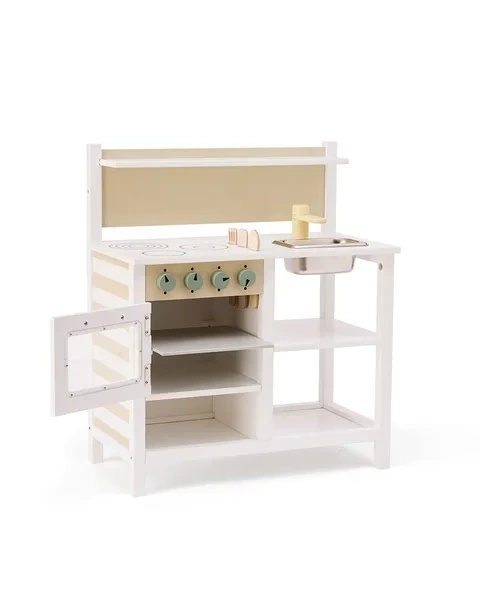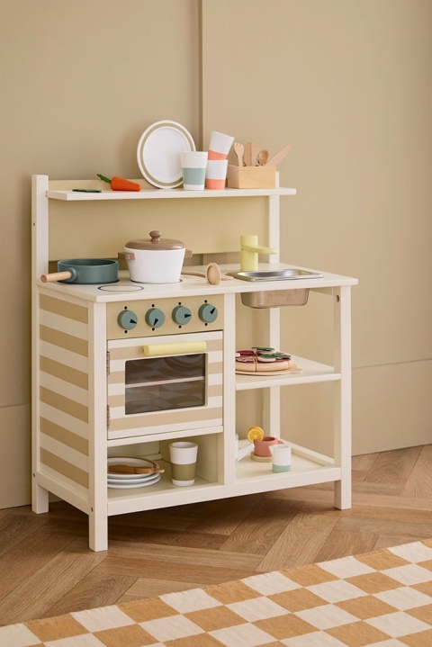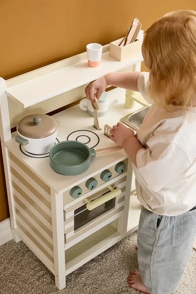 Wyposażona w otwierany piekarnik z wyjmowaną blachą, komplet garnków z uniwersalną pokrywką oraz trzy drewniane narzędzia: łyżkę, łopatkę i łyżkę cedzakową. Wszystko można łatwo uporządkować dzięki dedykowanym otworom na blacie i półce na drobiazgi. Pod blatem znajduje się dodatkowa otwarta przestrzeń do przechowywania naczyń lub akcesoriów.
