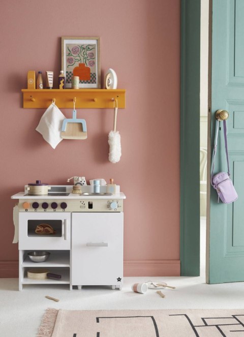 Bez obaw. Ta współczesna kuchnia jest wykonana z drewna z certyfikatem FSC i wyposażona w zmywarkę do naczyń, piekarnik, zlewozmywak, półki i zintegrowany okap kuchenny. Umieść kilka talerzy i sztućców na podstawce w zmywarce, a tabletkę włóż do otworu z przodu. Przekręć klikające pokrętło i gotowe. Jest też szczoteczka do mycia naczyń i płyn do usuwania wszelkich trudnych plam. Z boku znajdziesz trzy wieszaki, na których możesz zawiesić ściereczkę do naczyń. Zmywarka i przestrzeń pod piekarnikiem po zakończonej zabawie mogą stać się praktycznym schowkiem. Zestaw zawiera: kuchenkę i zmywarkę, ręcznik, szczoteczkę do naczyń, blachę do pieczenia, dozownik mydła w płynie z pompką i dwie tabletki do zmywarki w torbie do przechowywania.