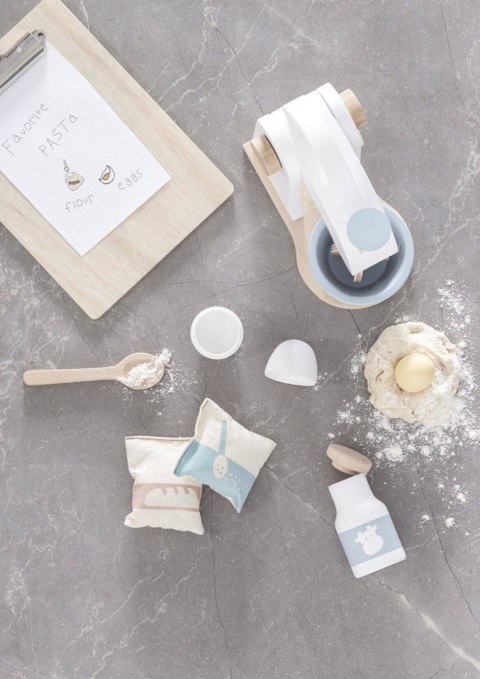Zestaw zawiera mikser z miską, chochlę, jajko, woreczek z bawełnianej tkaniny z mąką i cukrem oraz dzbanek na mleko. Trzepaczką i pokrętłem można kręcić, a ramię złożyć. Zabawka nieodpowiednia dla dzieci poniżej trzeciego roku życia