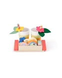 W zestawie znajdują się dwa szklane kubeczki, trzy słomki, różne drewniane owoce, kostki lodu i dekoracje z filcu, a także taca i pudełeczko do przechowywania. Wszystko razem sprzyja zabawie, która uczy kreatywności, współpracy i planowania.