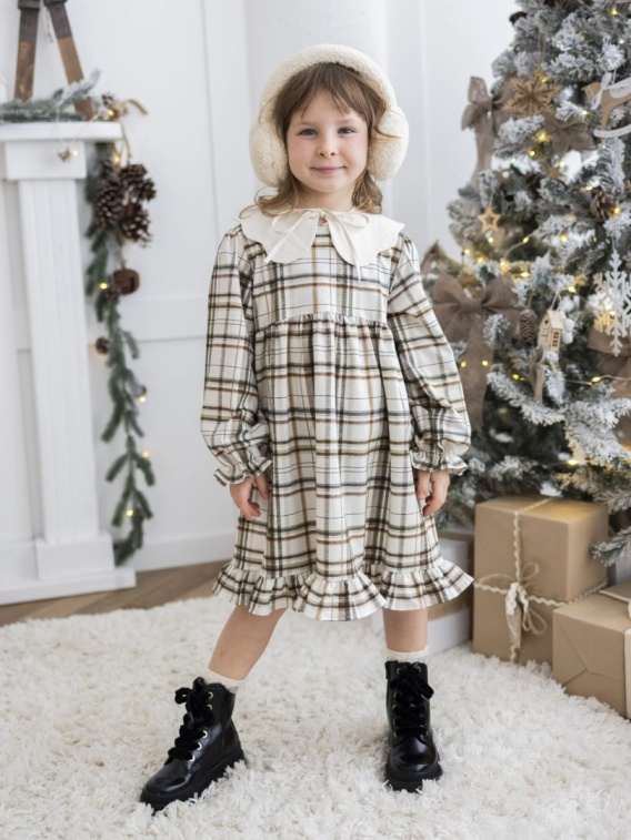 Sukienka w beżową kratę z długim rękawem. Zakończona falbanką. Kołnierzyk jest doliczany oddzielnie - dokupisz go tutaj.