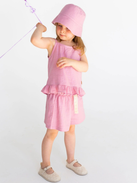 Letni komplet dla dziewczynki z brokatem. Bluzeczka wiązana na ramionach z falbanką i proste spodenki. Z lekkiego i przewiewnego muślinu.