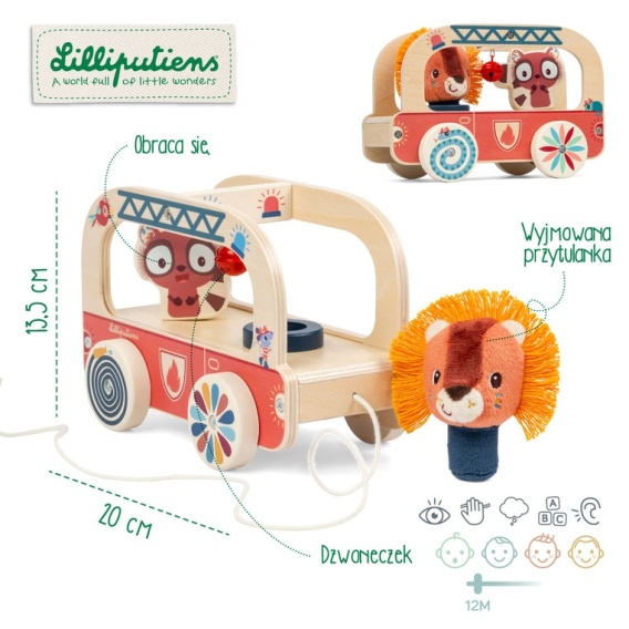 • Lilliputiens Drewniany wózek do ciągnięcia Wóz strażacki Lew Jack 12 m+