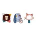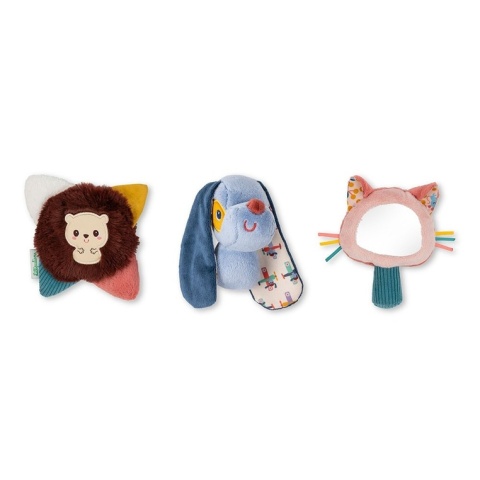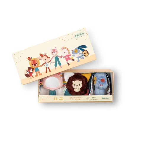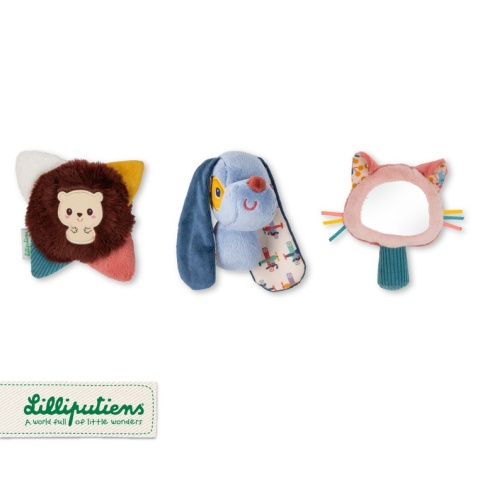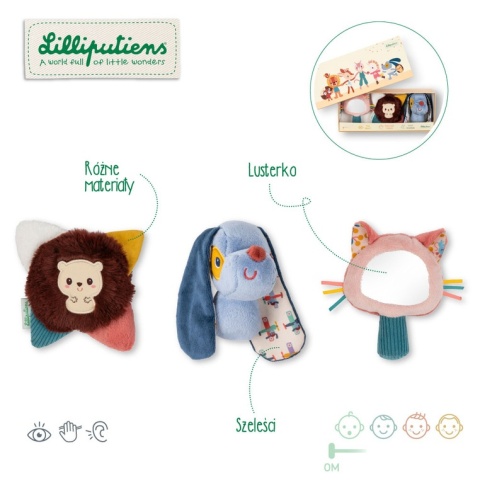 Zestaw 3 miękkich wielofunkcyjnych zabawek sensorycznych z kolekcji Piesek Jules belgijskiej marki Lilliputiens to niebanalna rozwojowa rozrywka dla niemowląt. W jego skład wchodzą: uszyty z materiałów o różnorodnej fakturze Jeżyk Leon, Piesek Jules z długimi szeleszczącymi uszami oraz Kotka Jeanne z bezpiecznym lusterkiem. Zestaw rozwija małą motorykę (chwytanie, potrząsanie), aktywizuje zmysł słuchu (szeleści), wzroku (lusterko) i dotyku (materiały o zróżnicowanej fakturze, liczne wystające detale).