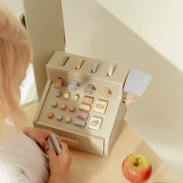 Drewniana kasa od Little Dutch to wyjątkowa propozycja dla małych sprzedawców i kupujących. Wykonana z certyfikowanego drewna FSC, zachwyca pięknym retro designem oraz nową, pastelową kolorystyką. Zestaw zawiera wszystkie akcesoria niezbędne do zabawy w sklep: terminal płatniczy, monety, banknoty oraz praktyczną szufladę kasową.