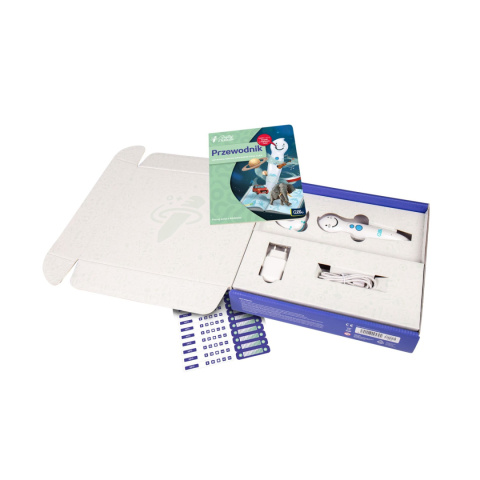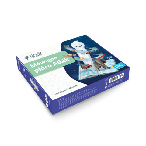 Zawartość opakowania: mówiące pióro Albik 1.0, ładowarka, kabel USB, podstawka pod pióro, przewodnik, 10 sztuk naklejek na odtwarzacz MP3, 10 sztuk naklejek regulacji głośności