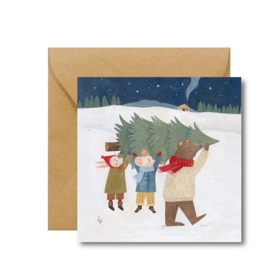 Kartka świąteczna ze zwierzatkami niosącymi choinkę na święta.