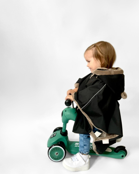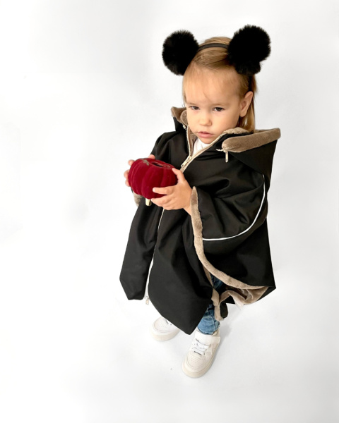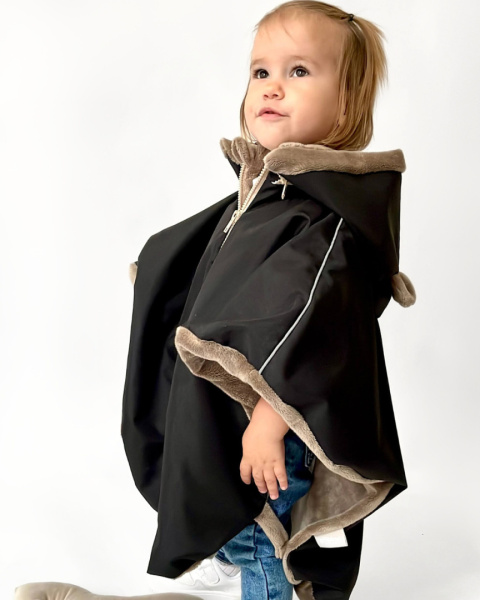 - Wodoodporna zewnętrzna warstwa, która chroni dziecko przed deszczem, śniegiem, wiatrem. Środek poncza wykonany z miękkiego i ciepłego futerka.