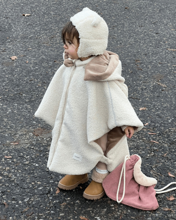 - Wodoodporna zewnętrzna warstwa, która chroni dziecko przed deszczem, śniegiem, wiatrem. Środek poncza wykonany z miękkiego i ciepłego futerka.