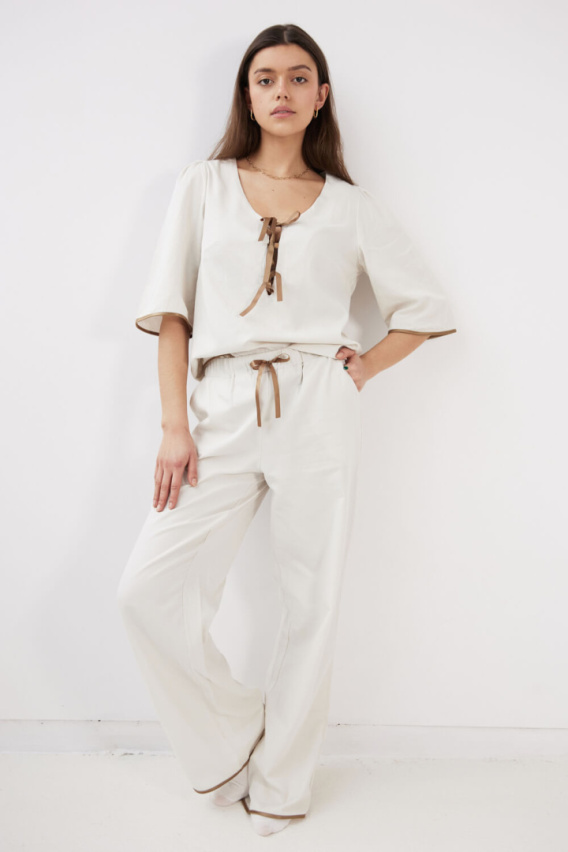 Spodnie proste, z szeroką nogawką i elastyczną talią. Ozdobne akcenty na nogawce oraz kokarka w pasie dodają im modnego looku. Można je świetnie zestawić z ulubionym t-shirtem.