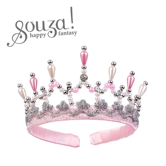 Korona tiara Mary holenderskiej marki Souza!. Koronę, znajdującą się na owiniętą jasnoróżową wstążką opasce, można wsuwać na włosy lub czoło. Jej kunsztowny front pokryty jest srebrnym ornamentem, a górę z wyższym elementem na środku zdobią perłowe, srebrne i różowe koraliki różnej wielkości i kształtów. Tiara jest lekka, delikatna i przyjemna w noszeniu (nie uciska). Idealna na przyjęcia i jako uzupełnienie przebrania księżniczki. Sprawdzi się także jako stylowy prezent.