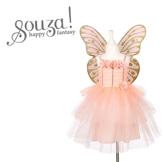 Kostium sukienka ze skrzydłami elfa Annemarie holenderskiej marki Souza! to przepiękne, kunsztownie wykonane przebranie dla dziewczynki. Sukienka ma klasyczny krój na ramiączkach i gumkę w pasie. Jest miękka i wsuwana przez głowę. Zachwyca dbałością o detale. Góra tej różowo-złotej sukienki jest dwustronna: z przodu ma upięcie z marszczonego tiulu, trzy ozdobne złote paski i kwiaty przy dekolcie oraz jeden w talii, z tyłu jest aksamitna i gładka. Dół stanowi spódniczka z podszewką i kilkoma warstwami tiulu w różnych długościach. W skład zestawu wchodzą także półprzeźroczyste jasnoróżowe skrzydła ze złotymi wzorami. Można je nosić razem z sukienką lub osobno. Zakładane są na wygodne gumowane ramiona. Strój jest efektowny i komfortowy do noszenia. To idealne przebranie na bal przebierańców czy Sylwestra. Sprawdzi się także jako prezent.