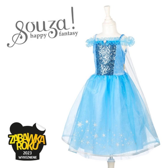 Kostium sukienka królowej śniegu holenderskiej marki Souza! to przepiękne, kunsztownie wykonane przebranie dla dziewczynki. Ma klasyczny krój na ramiączkach i gumkę w pasie. Jest miękka i wsuwana przez głowę. Zachwyca dbałością o detale. Góra tej intensywnie niebieskiej sukienki jest uszyta z aksamitu z cekinowym frontem, falbanką z tiulu i białym pomponikiem przy dekolcie. Z tyłu na także zintegrowaną srebrną pelerynę. Dół to urokliwa spódniczka z podszewką i dwoma warstwami tiulu – ciemniejszą pod spodem i jasnoniebieską na wierzchu. Na tej ostatniej połyskują srebrne cekinowe śnieżynki, jest też obszyta srebrną lamówką. Sukienka jest przyjemna w dotyku i komfortowa do noszenia. Idealna na bal przebierańców czy Sylwestra. Sprawdzi się także jako prezent.