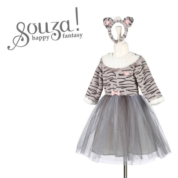 Kostium kotka Catia holenderskiej marki Souza! to przepiękne, kunsztownie wykonane przebranie dla dziewczynki. Sukienka ma klasyczny krój z długim rękawem i gumkę w pasie. Jest miękka i wsuwana przez głowę. Zachwyca dbałością o detale. Góra jest wykonana z szarego pluszu w czarne prążki, a dół to lekko rozkloszowana szara spódniczka z poszewką i warstwami tiulu. Przy mankietach i dekolcie obszyta białym futerkiem. Na wysokości pasa z tyłu ma naszyty długi koci ogon z białą końcówką, z przodu zaś – różową kokardkę. Sukienka jest przyjemna w dotyku i komfortowa do noszenia. W zestawie znajduje się też opaska z kocimi uszami – pokryta szarym futerkiem w prążki. Strój jest idealny na bal przebierańców czy Sylwestra. Sprawdzi się także jako prezent.