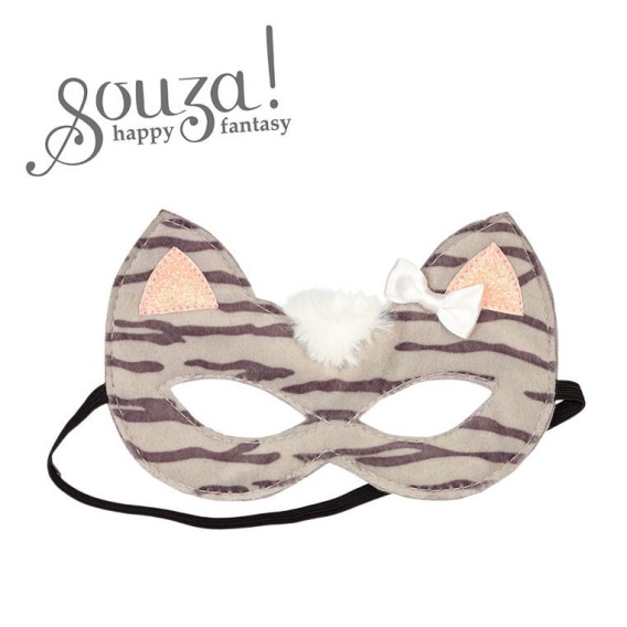 Pluszowa szara prążkowana maska kotki Catia holenderskiej marki Souza! Zachwyca detalami, m.in. różowym brokatowym wypełnieniem uszek, białą kokardką przy uchu i futerkową grzywką. Łatwa do zakładania i zdejmowania dzięki gumce. Stanowi idealny dodatek do kostiumu kotki, na bal przebierańców czy Sylwestra. Sprawdzi się także jako prezent.