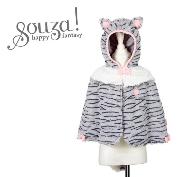 Pluszowa narzutka z kapturem kotka Catia holenderskiej marki Souza! to przepiękne uzupełnienie lub samodzielna przebranie dla dziewczynek. Jest efektowna, szara w czarne prążki, ma biały futerkowy kołnierzyk, różowe detale (kokardki, obszycia i wnętrze uszek przy kapturze), jak również długi szary prążkowany ogon z białą końcówką. Jest miękka i przyjemna w dotyku. Zapinana pod szyją na haftkę. Komfortowa do noszenia. Nadaje się także na prezent.