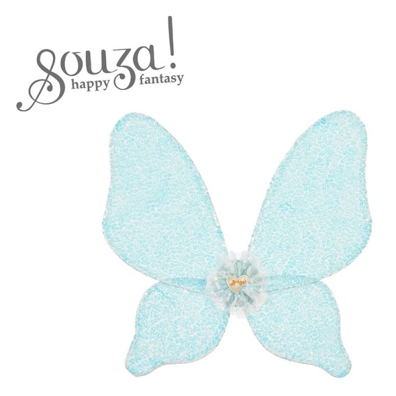 Niebieskie skrzydła Florentina holenderskiej marki Souza! są wykonane z obszytego cekinami tiulu na metalowym stelażu. Mają 45 cm wysokości i ozdobny detal (też z tiulu cekinów) na środku. Są łatwe do zakładania i zdejmowania dzięki gumce.