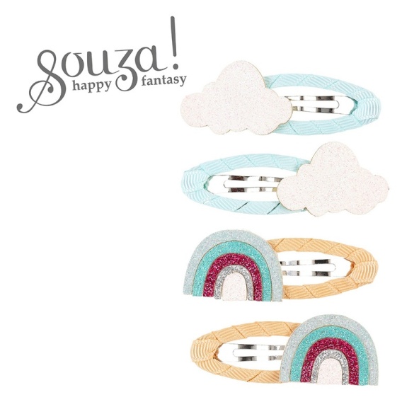 Komplet 4 spinek do włosów Yaella holenderskiej marki Souza! Na dwóch z nich znajduje się aplikacja brokatowej chmurki, a na dwóch pozostałych – tęczy. Metalowa część obciągnięta jest wokół ryflowaną wstążką (jasnoniebieską i beżową). Zaciski na klik sprawiają, że ozdoby stabilnie trzymają się włosów. Idealne zarówno na przyjęcia, jak i na co dzień. Sprawdzą się także jako stylowy prezent.