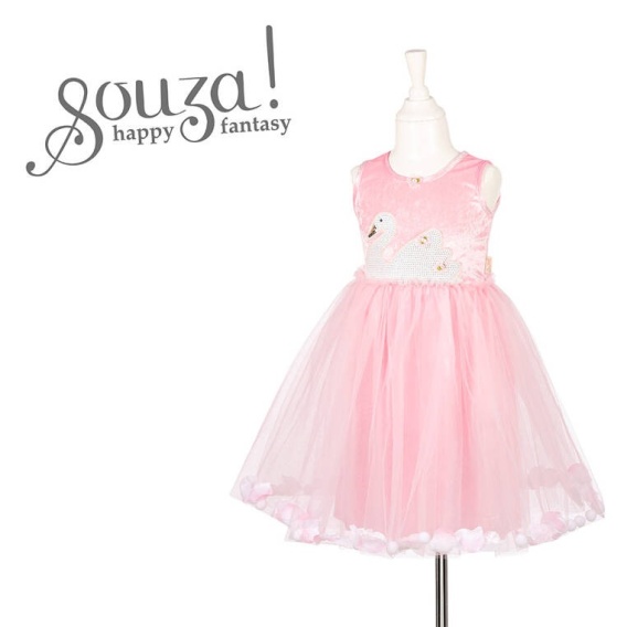 Sukienka wizytowa tiulowa Swan holenderskiej marki Souza! to przepiękne, kunsztownie wykonane ubranie dla dziewczynki. Ma klasyczny krój z szerokimi ramiączkami i gumkę w pasie. Jest miękka i wsuwana przez głowę. Zachwyca dbałością o detale. Góra tej jasnoróżowej sukienki jest uszyta z aksamitnego materiału z cekinową aplikacją łabędzia na przodzie i maleńkim kwiatem przy dekolcie. Dół to urokliwa spódniczka z podszewką i podwójną warstwą tiulu, wewnątrz której znajdują się różowe płatki kwiatów i białe pomponiki. Wokół talii tiul jest upięty w uroczą małą falbankę. Sukienka jest przyjemna w dotyku i komfortowa do noszenia. To idealne ubranie na wszelkie przyjęcia (np. wesele czy urodziny), na bale przebierańców czy Sylwestra. Sprawdzi się także jako prezent.