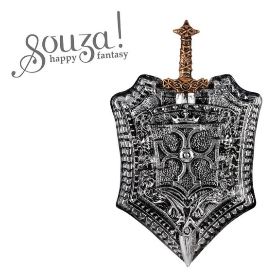 Tarcza i miecz rycerski Milan holenderskiej marki Souza! to bogato zdobiony komplet akcesoriów. Ciemno-srebrna „rzeźbiona” tacza, imitująca metal, wyposażona jest w otwór na miecz oraz dwa wygodne uchwyty. Miecz ma ciemno-złotą ozdobną rękojeść. Całość jest lekka i komfortowa do noszenia. Stanowi idealny dodatek do kostiumu rycerza na przedstawienie lub bal przebierańców. Sprawdzi się także jako prezent.