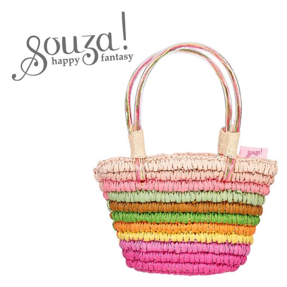 Torebka do ręki dla dzieci Alivia holenderskiej marki Souza! jest poręczna i całkiem pojemna. Ma formę plecionego koszyczka w kolorowe oplecione słomką pasy, m.in. w odcieniach różu i zieleni. Słomkowe rączki wzmocnione są transparentną rurką z solidnego tworzywa i ozdobione plecionką w naturalnym słomkowym kolorze. Koszyczek pomieści niezbędne drobiazgi. Idealny jako dodatek do letniego, plażowego stroju czy na przyjęcia, i do noszenia na co dzień. Nadaje się także na prezent.