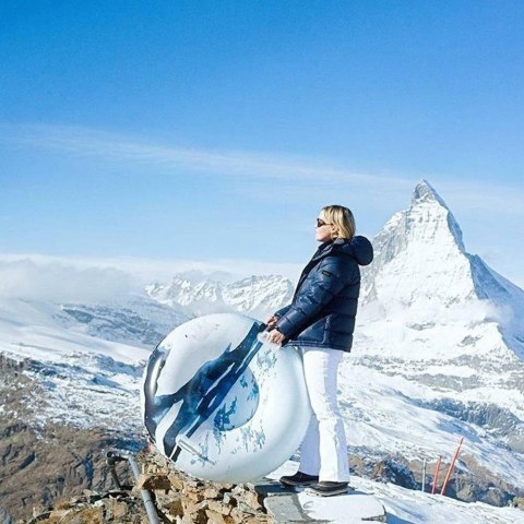 Nadmuchiwane koło do jazdy po śniegu o średnicy 1,1 m ozdobione zostało dwustronnym drukiem ze specjalnie zaprojektowanymi, niebanalnymi wzorami.