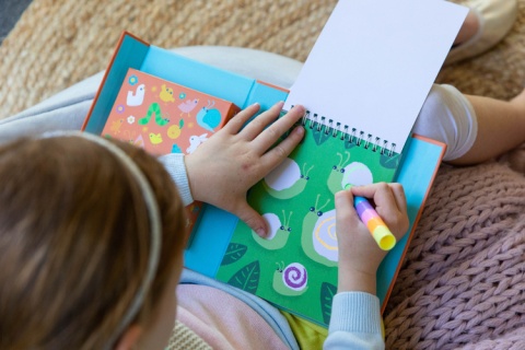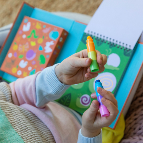 Skład zestawu: 6 nakładanych, neonowych miękkich kredek, 36-stronicowa książeczka z zadaniami, 5 arkuszy kolorowych naklejek, pudełko do przechowywania