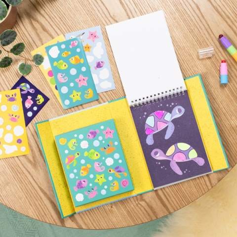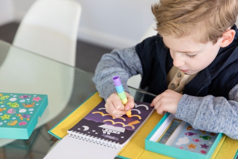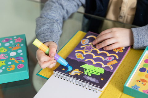 Skład zestawu: 6 nakładanych, neonowych miękkich kredek, 36-stronicowa książeczka z zadaniami, 5 arkuszy kolorowych naklejek, pudełko do przechowywania