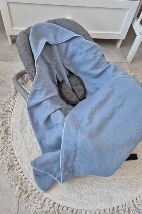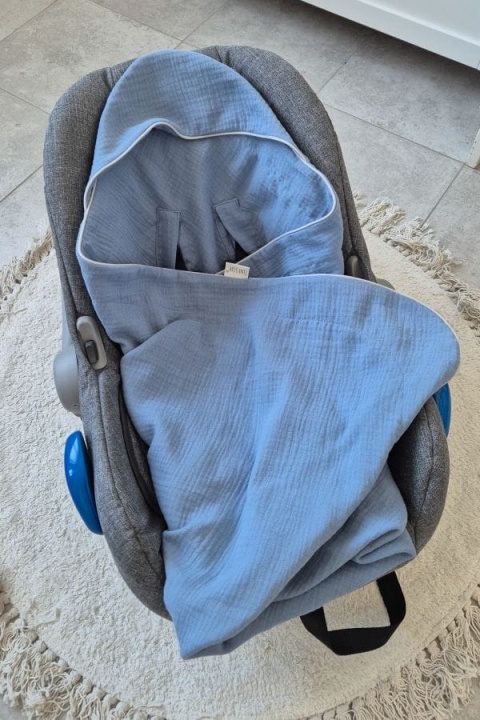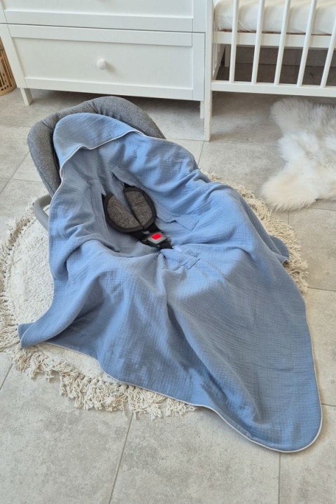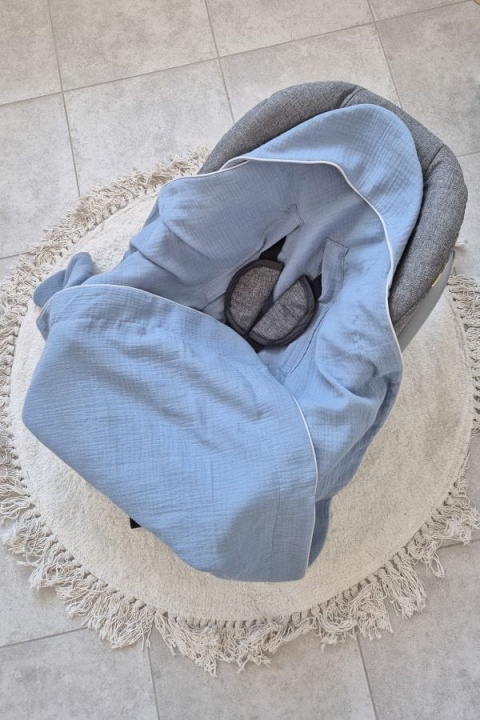 Letni otulacz do fotelika samochodowego dla niemowląt zapewnia bezpieczną jazdę samochodem. Uszyty z muślinu 100% bawełna, nie zawiera wypełnienia, dzięki czemu może chronić przed słońcem oraz przegrzaniem, służy jako lekki kocyk gdy zrobi się chłodno. Otulacz odgradza niemowlę od nieprzyjemnego, plastikowego fotelika.